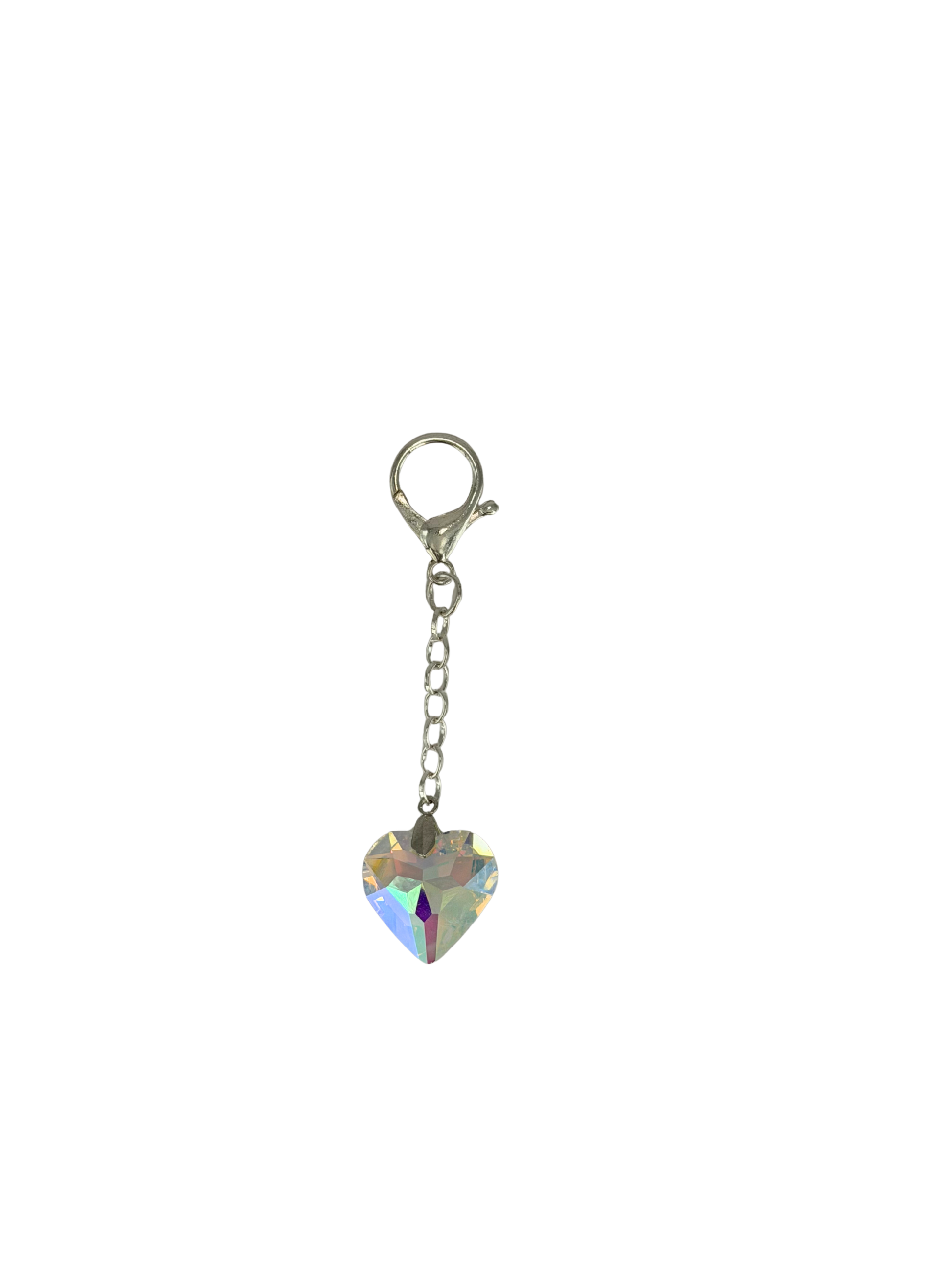 A translucent heart charm with a soft iridescent glow, suspended from a dainty silver chain. Catching the light with every movement, it adds a subtle, luminous touch to your bag or keys.