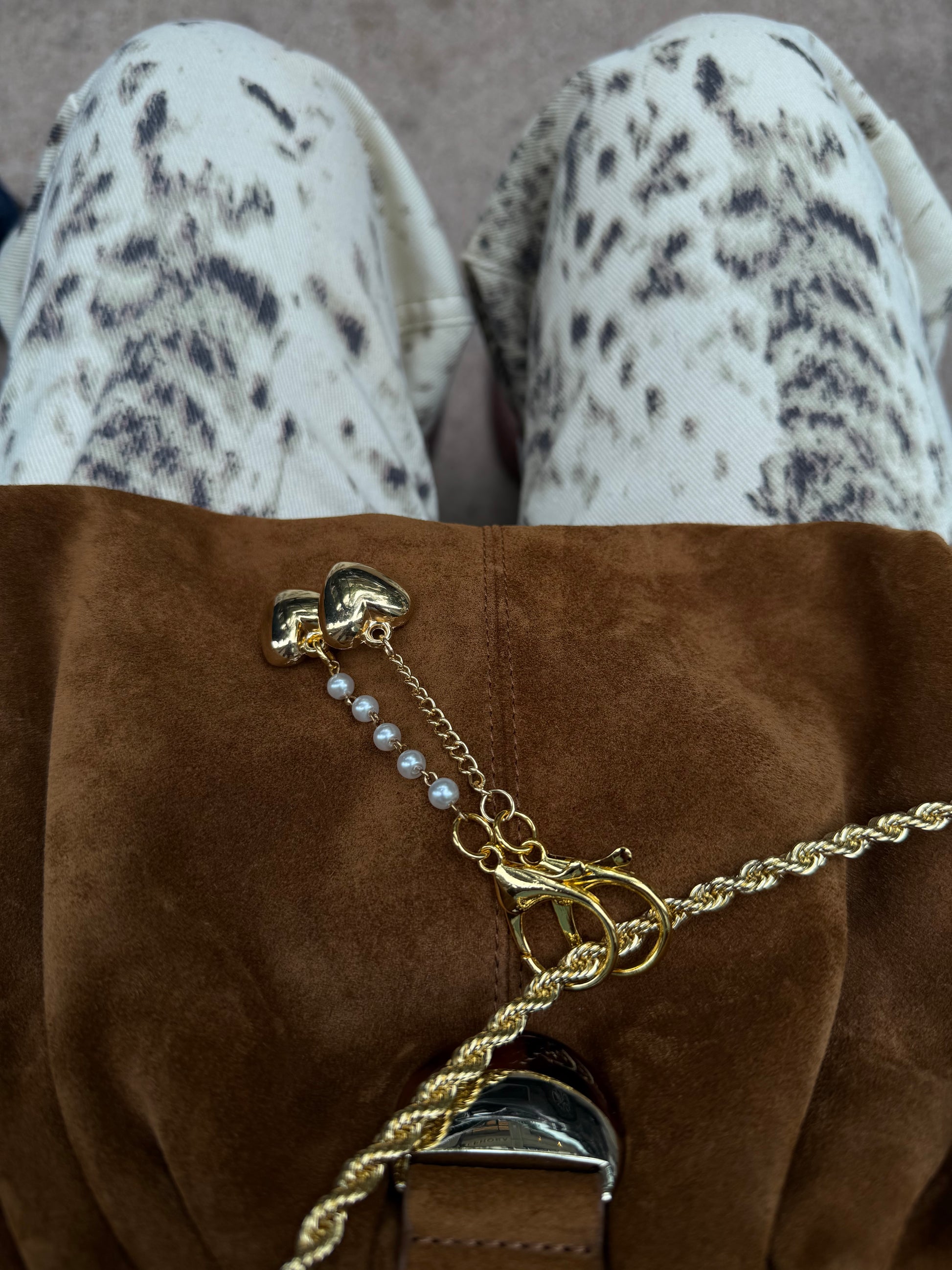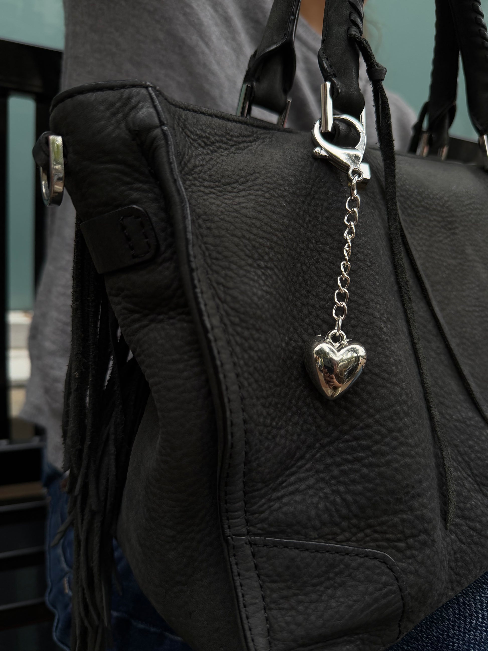 A sleek, polished gold or silver heart charm in a smaller silhouette, suspended from a dainty gold or silver chain to add a subtle, timeless touch to your bag or keys. Simple, sweet, and effortlessly classic.