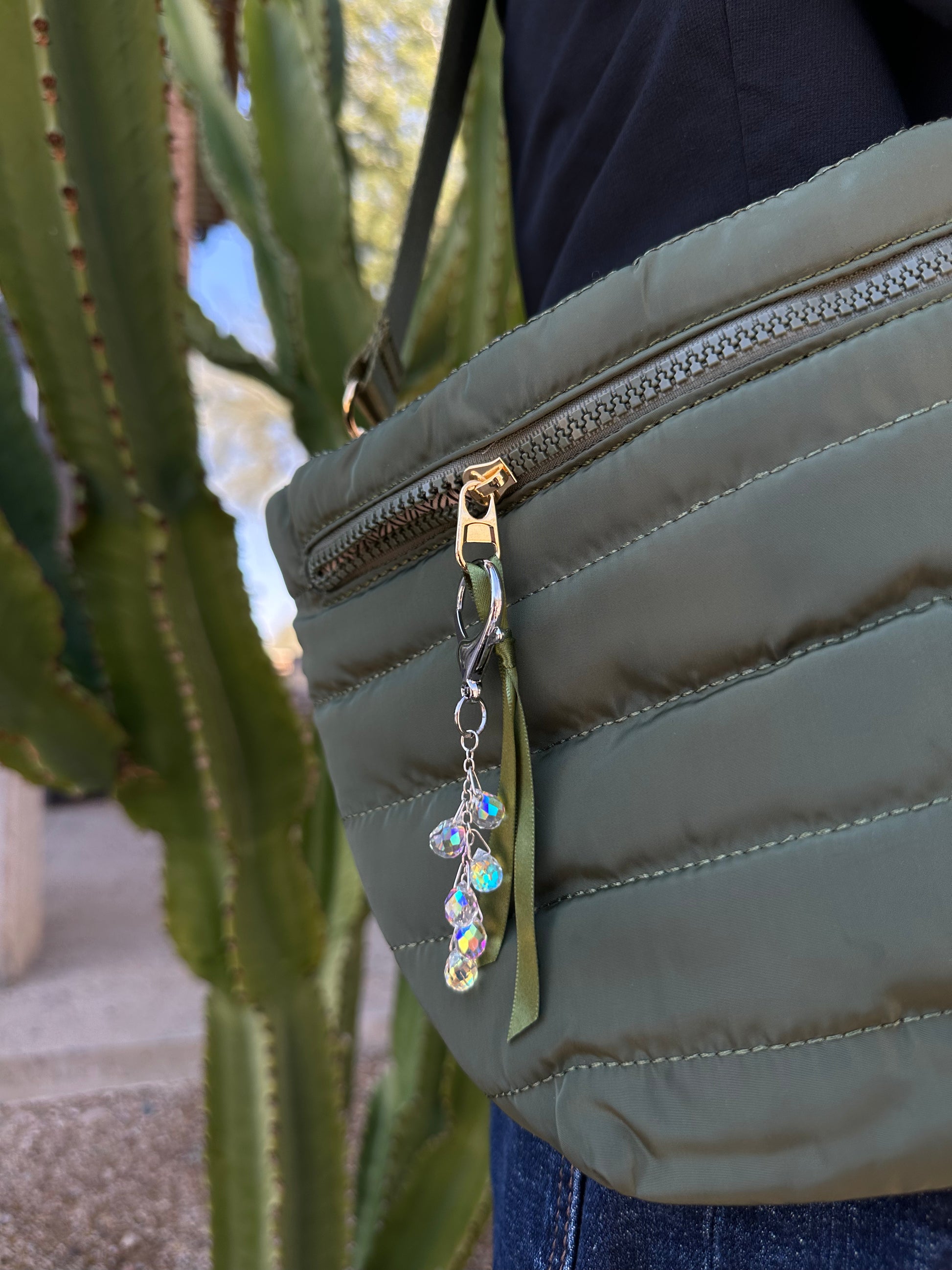 A sleek, cascading charm featuring iridescent crystals that catch the light from every angle. Designed for effortless elegance, it adds a subtle shimmer to any bag!